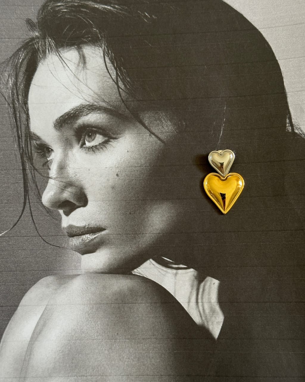 The Giselle Earrings are a charming heart-shaped drop earrings that add a touch of romance to any outfit. The Giselle Earrings more specifically, has a small silver heart stacked on top of the big gold heart. Crafted from stainless steel and plated with silver and gold, these earrings offer a stylish and durable finish.